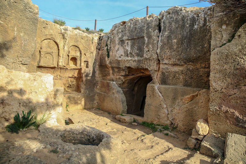 Kawałek za północno-zachodnią granicą murów miejskich starożytnego Nea Pafos odkryto nekropolię wypełnioną wykutymi w skale, bogato zdobionymi grobowcami. Cmentarzysko powstało około II wieku p.n.e. - w okresie panowania Ptolemeuszów, kiedy miasto pełniło funkcję stolicy wyspy. W centralnej części kilku najbardziej monumentalnych grobowców znajdował się dorycki perystyl, czyli wewnętrzny dziedziniec otoczony kolumnami, do którego prowadził korytarz ze schodami, znany jako dromos. Wokół tego dziedzińca rozmieszczone były komnaty grobowe, zdobione freskami i płaskorzeźbami. Miejsce to było przeznaczone dla najważniejszych członków społeczności. Pozostałe grobowce były już znacznie skromniejsze.