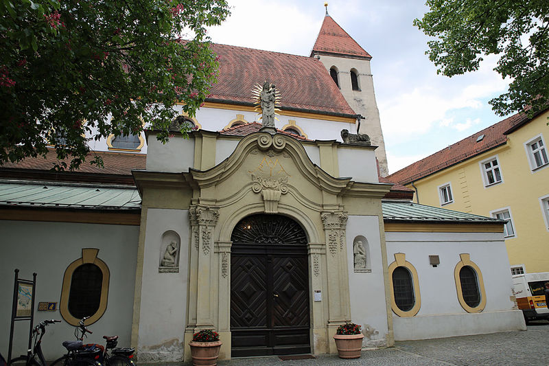 Do świątyni najlepiej wejść gotyckim portalem przez kryte podwórze od strony placu Emmerama (Emmeramsplatz), które wypełnione jest grobami i bardzo starymi kamiennymi płaskorzeźbami.